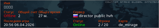 Играет на Counter Strike Global Offensive сервере. Страна: РоссияПервый раз замечен 00:13 02.04.2026
