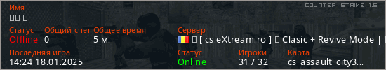Играет на Counter Strike 1.6 сервере. Страна: РумынияПервый раз замечен 14:18 18.01.2025