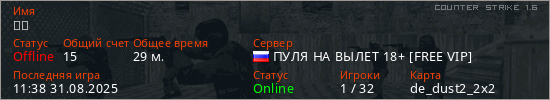 Играет на Counter Strike 1.6 сервере. Страна: РоссияПервый раз замечен 18:12 30.08.2025