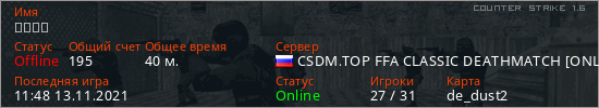 Играет на Counter Strike 1.6 сервере. Страна: РоссияПервый раз замечен 22:27 12.11.2021
