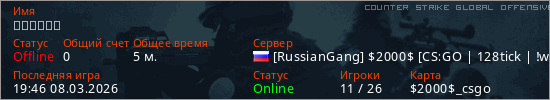 Играет на Counter Strike Global Offensive сервере. Страна: РоссияПервый раз замечен 19:42 08.03.2026