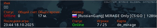 Играет на Counter Strike Global Offensive сервере. Страна: РоссияПервый раз замечен 21:33 17.10.2025