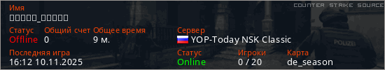 Играет на Counter Strike Source сервере. Страна: РоссияПервый раз замечен 14:05 09.11.2025