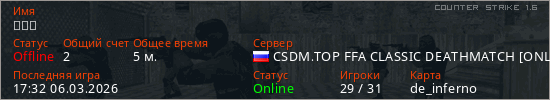 Играет на Counter Strike 1.6 сервере. Страна: РоссияПервый раз замечен 17:26 06.03.2026