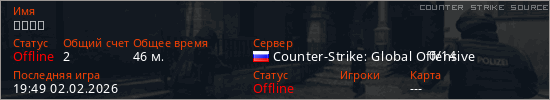 Играет на Counter Strike Source сервере. Страна: РоссияПервый раз замечен 22:03 25.01.2026