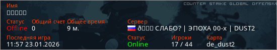 Играет на Counter Strike Global Offensive сервере. Страна: РоссияПервый раз замечен 20:49 22.01.2026