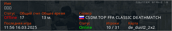 Играет на Counter Strike 1.6 сервере. Страна: РоссияПервый раз замечен 07:52 15.03.2025