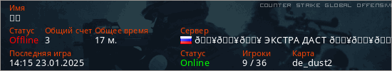 Играет на Counter Strike Global Offensive сервере. Страна: РоссияПервый раз замечен 11:55 23.01.2025