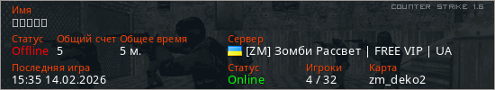 Играет на Counter Strike 1.6 сервере. Страна: УкраинаПервый раз замечен 15:33 14.02.2026