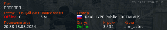 Играет на Counter Strike 1.6 сервере. Страна: РоссияПервый раз замечен 20:32 18.08.2024