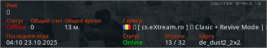Играет на Counter Strike 1.6 сервере. Страна: РумынияПервый раз замечен 04:20 19.10.2025