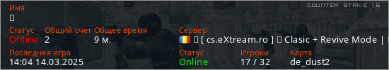 Играет на Counter Strike 1.6 сервере. Страна: РумынияПервый раз замечен 13:43 24.12.2024
