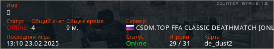 Играет на Counter Strike 1.6 сервере. Страна: РоссияПервый раз замечен 19:43 22.02.2025