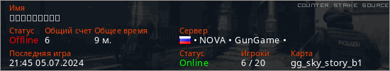 Играет на Counter Strike Source сервере. Страна: РоссияПервый раз замечен 21:34 05.07.2024
