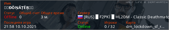 Играет на Half Life 2 DeathMatch сервере. Страна: РоссияПервый раз замечен 21:58 10.10.2025