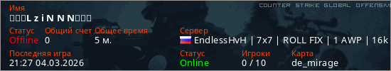 Играет на Counter Strike Global Offensive сервере. Страна: РоссияПервый раз замечен 21:20 04.03.2026