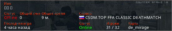 Играет на Counter Strike 1.6 сервере. Страна: РоссияПервый раз замечен 14:28 06.01.2025