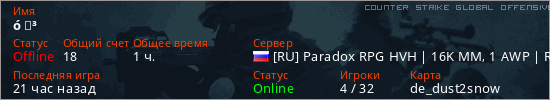 Играет на Counter Strike Global Offensive сервере. Страна: РоссияПервый раз замечен 19:44 06.05.2025