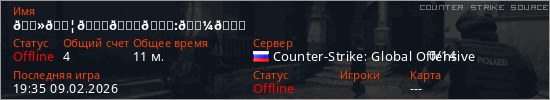 Играет на Counter Strike Source сервере. Страна: РоссияПервый раз замечен 21:41 08.02.2026