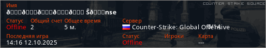 Играет на Counter Strike Source сервере. Страна: РоссияПервый раз замечен 14:10 12.10.2025
