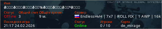 Играет на Counter Strike Global Offensive сервере. Страна: РоссияПервый раз замечен 19:46 23.02.2026