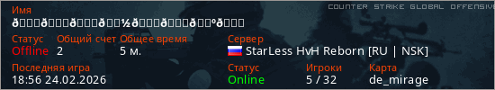 Играет на Counter Strike Global Offensive сервере. Страна: РоссияПервый раз замечен 18:54 24.02.2026