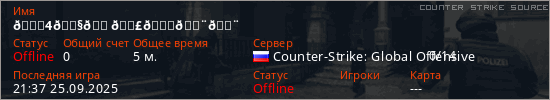 Играет на Counter Strike Source сервере. Страна: РоссияПервый раз замечен 20:46 25.09.2025