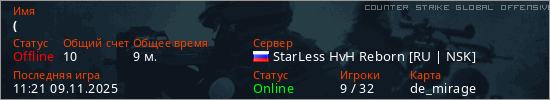 Играет на Counter Strike Global Offensive сервере. Страна: РоссияПервый раз замечен 13:35 08.11.2025
