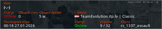 Играет на Counter Strike 1.6 сервере. Страна: ЛатвияПервый раз замечен 00:16 27.01.2026