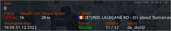 Играет на Counter Strike 1.6 сервере. Страна: РумынияПервый раз замечен 19:25 31.12.2022