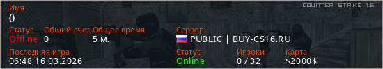 Играет на Counter Strike 1.6 сервере. Страна: РоссияПервый раз замечен 06:46 16.03.2026