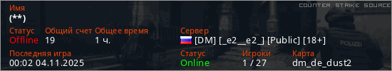 Играет на Counter Strike Source сервере. Страна: РоссияПервый раз замечен 20:24 29.08.2025