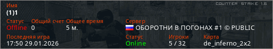 Играет на Counter Strike 1.6 сервере. Страна: РоссияПервый раз замечен 16:56 29.01.2026
