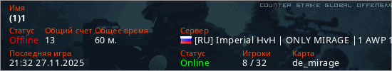 Играет на Counter Strike Global Offensive сервере. Страна: РоссияПервый раз замечен 20:50 05.08.2025