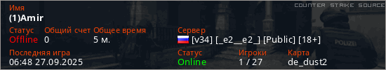 Играет на Counter Strike Source сервере. Страна: РоссияПервый раз замечен 06:46 27.09.2025