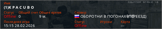 Играет на Counter Strike 1.6 сервере. Страна: РоссияПервый раз замечен 15:02 26.02.2026