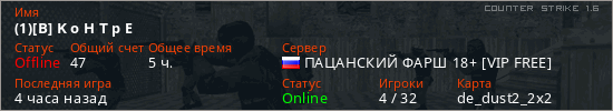 Играет на Counter Strike 1.6 сервере. Страна: РоссияПервый раз замечен 18:35 06.03.2026