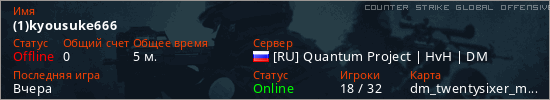 Играет на Counter Strike Global Offensive сервере. Страна: РоссияПервый раз замечен 20:14 10.04.2026