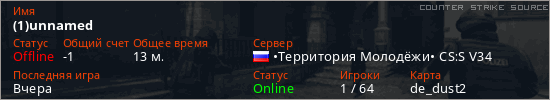 Играет на Counter Strike Source сервере. Страна: РоссияПервый раз замечен 19:31 19.11.2025