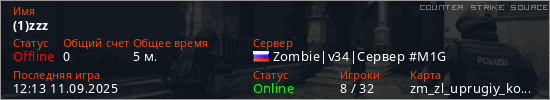 Играет на Counter Strike Source сервере. Страна: РоссияПервый раз замечен 11:57 11.09.2025