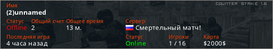 Играет на Counter Strike 1.6 сервере. Страна: РоссияПервый раз замечен 00:22 20.03.2026