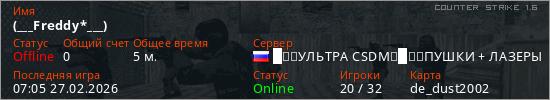 Играет на Counter Strike 1.6 сервере. Страна: РоссияПервый раз замечен 06:49 27.02.2026