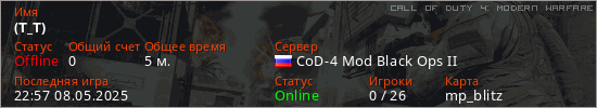 Играет на Call of Duty 4: Modern Warfare сервере. Страна: РоссияПервый раз замечен 22:46 08.05.2025