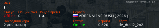 Играет на Counter Strike 1.6 сервере. Страна: РоссияПервый раз замечен 19:15 05.02.2026