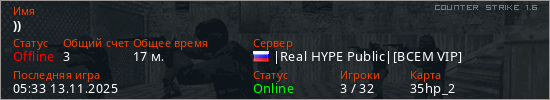 Играет на Counter Strike 1.6 сервере. Страна: РоссияПервый раз замечен 23:25 16.02.2025