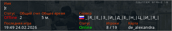 Играет на Counter Strike 1.6 сервере. Страна: РоссияПервый раз замечен 19:47 24.02.2026