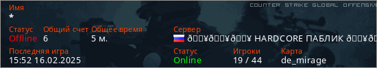 Играет на Counter Strike Global Offensive сервере. Страна: РоссияПервый раз замечен 15:27 16.02.2025