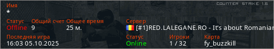 Играет на Counter Strike 1.6 сервере. Страна: РумынияПервый раз замечен 13:11 08.05.2025