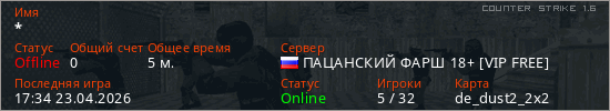 Играет на Counter Strike 1.6 сервере. Страна: РоссияПервый раз замечен 17:32 23.04.2026