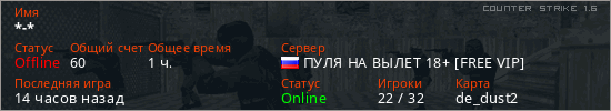 Играет на Counter Strike 1.6 сервере. Страна: РоссияПервый раз замечен 17:58 13.10.2025